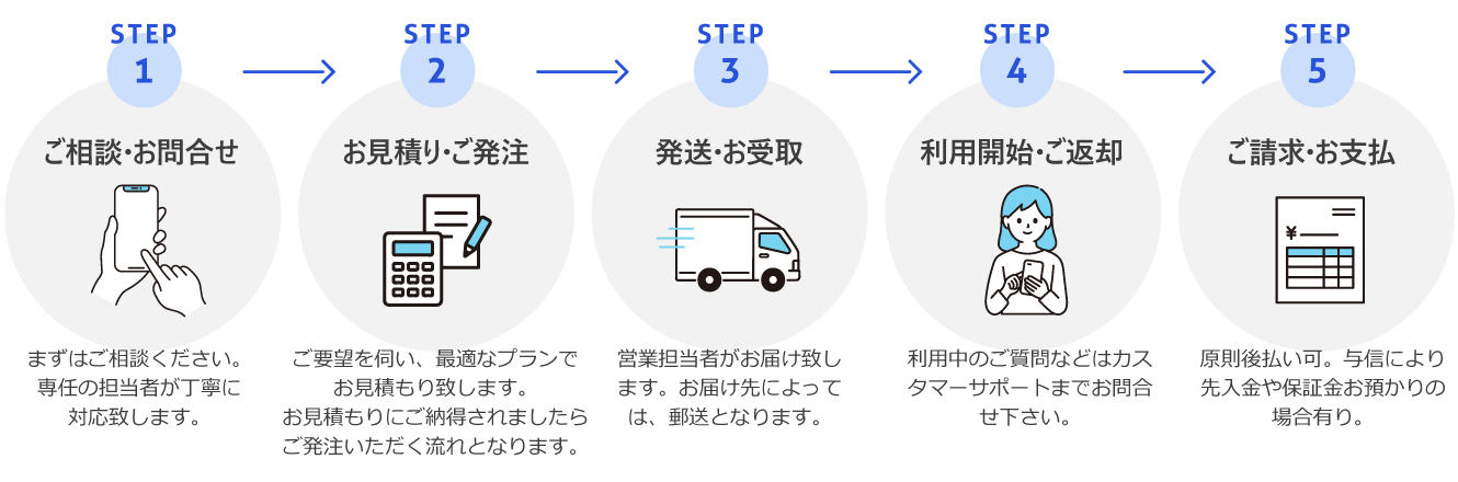 弊社ではお支払いや納品/返却の方法など、お客様のご要望に柔軟に対応させて頂きます。